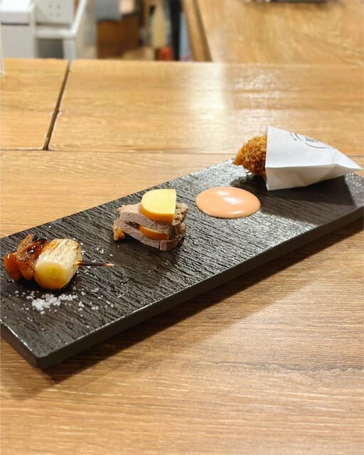 お通しは、とてもオシャレな感じで、瞬間燻製鴨チーズの燻製の香りがよく美味しかったです。