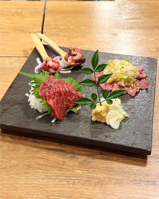 鴨と馬刺し4種盛りは、鴨のヘルシーさが伝わる美味しさで味付けされたネギと一緒に頂くととても美味しく、馬は弾力ある歯ごたえで、玉ねぎと甘口醤油と合う美味しさで共に満足でした。